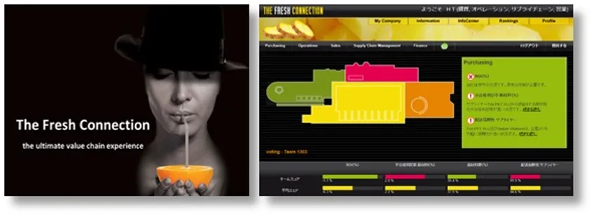・トレーニングの当初、仮想の飲料メーカー「The Fresh Connection社」は、業績が赤字低迷の状況にあり、納期遅延や欠品、倉庫の容量不足など様々な問題を抱えています。『営業』『調達』『オペレーション(製造・倉庫)』『サプライチェーンマネジメント』の各マネジメント分野において、早急な対策が求められます。経営チームは4名1組で構成され、The Fresh Connection社の経営状況を財務情報、生産・調達・販売・在庫に関する様々な情報から分析・評価し、限られた時間内に事業戦略立案と経営判断の実施、投資効果の評価をしていきます。