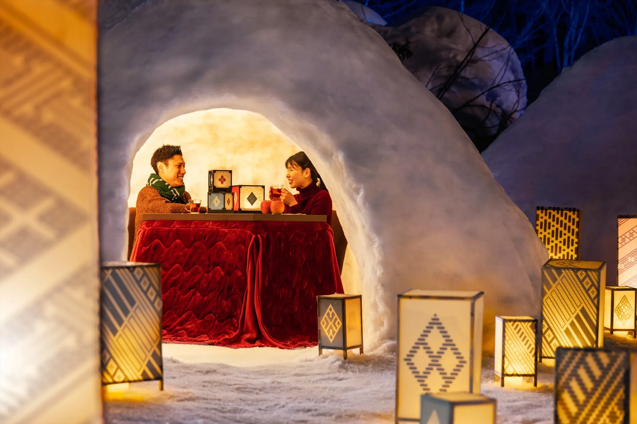 南津軽・大鰐に位置する青森県の温泉旅館「界 津軽」では、「こぎんかまくら」で楽しむこぎん尽くし体験を開催します。津軽の季節ごとの風情を楽しむことができる「津軽四季の水庭」に設置されたかまくらを、津軽地方の伝統工芸「津軽こぎん刺し」のデザインを施した燈籠が照らし、幻想的な空間を演出します。プライベート感あるかまくらの中では、こぎん刺し模様のお菓子や、りんごのカクテルを楽しみながらゆったりと過ごすことができます。