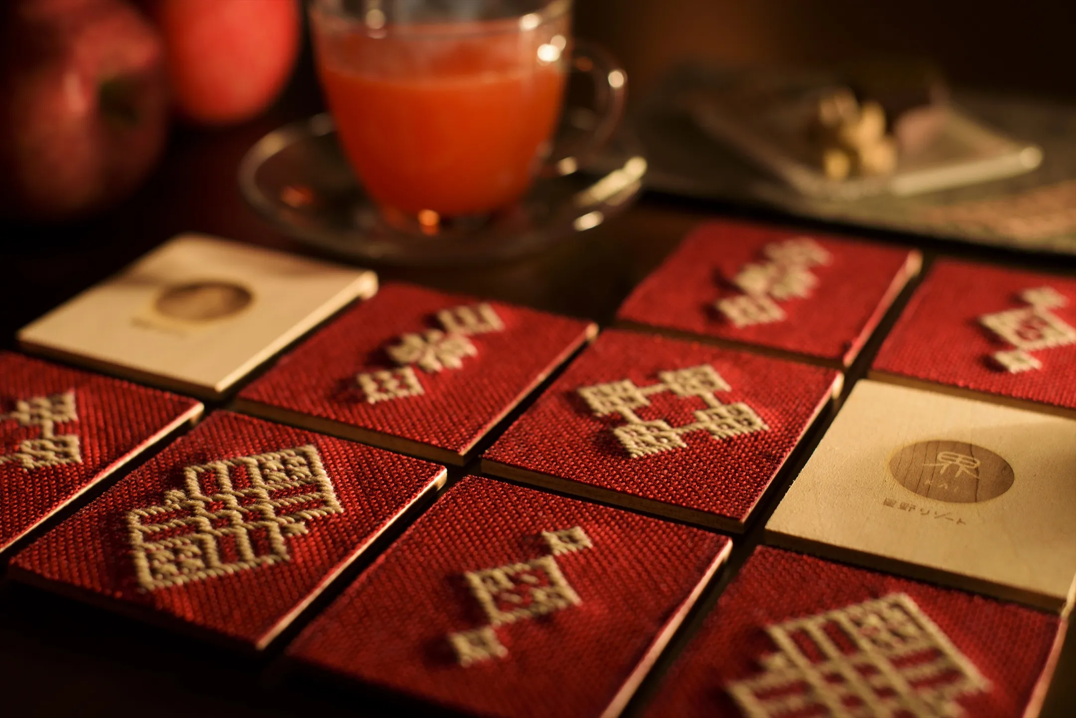 かまくらでゆったり過ごしていただけるように、地元の洋菓子店が作った、こぎん模様のかわいらしいチョコレートを提供します。また、青森県が生産量全国1位を誇るりんごを使ったホットカクテルも用意しています。お酒が苦手でも楽しめるノンアルコールカクテルもあります。