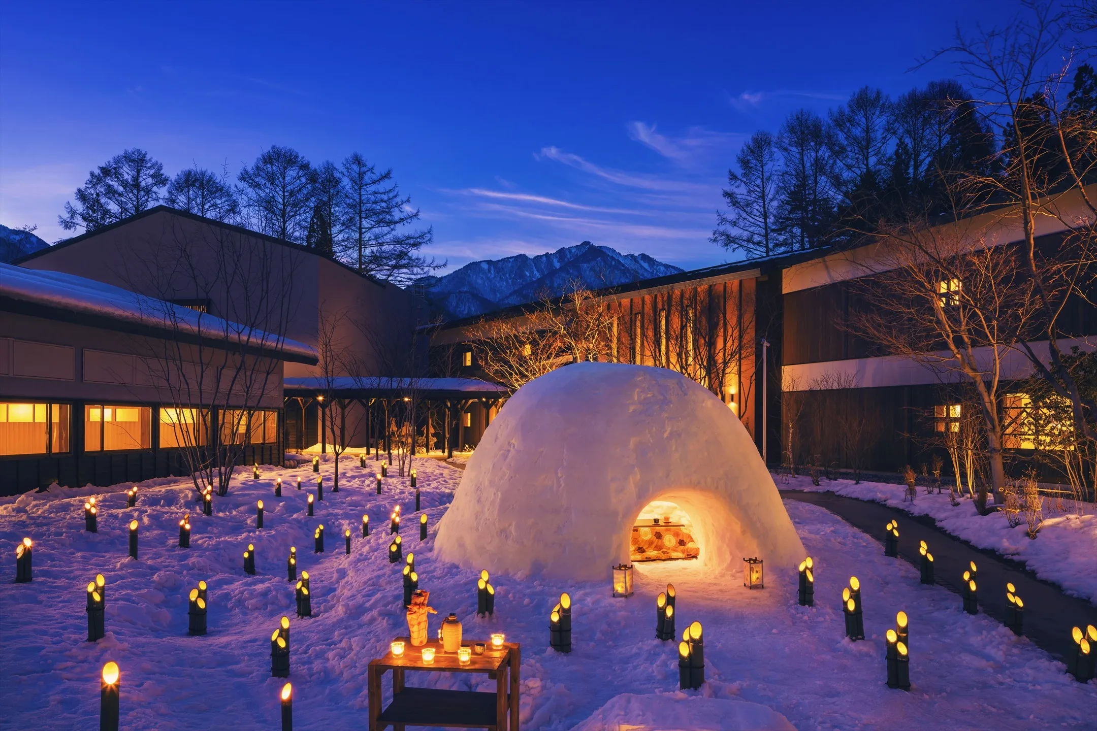 長野県・大町温泉の温泉旅館「界 アルプス」では、童心に返って雪国・信州ならではの暮らしを楽しむ「信州かまくら雪ん子体験」を開催します。北アルプスの麓に位置する大町市は、信州の中でも雪が多く降る地域で、厳しい冬とともに暮らす知恵が根付いています。界 アルプスでは、「雪ん子」に扮して、中庭にあるかまくらで外遊びを楽しめます。竹灯籠が並ぶあたたかな空間で、信州の冬を体感できます。