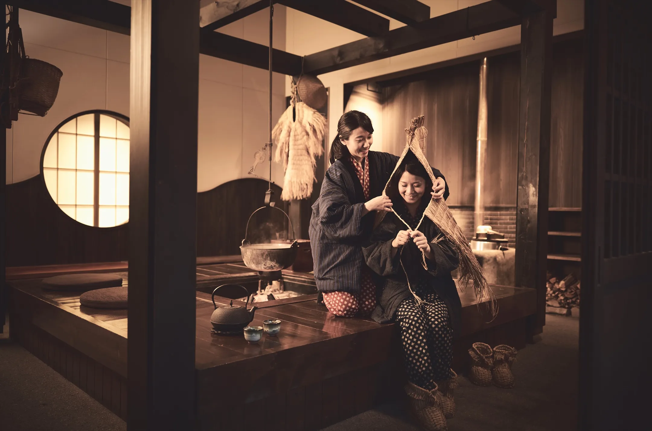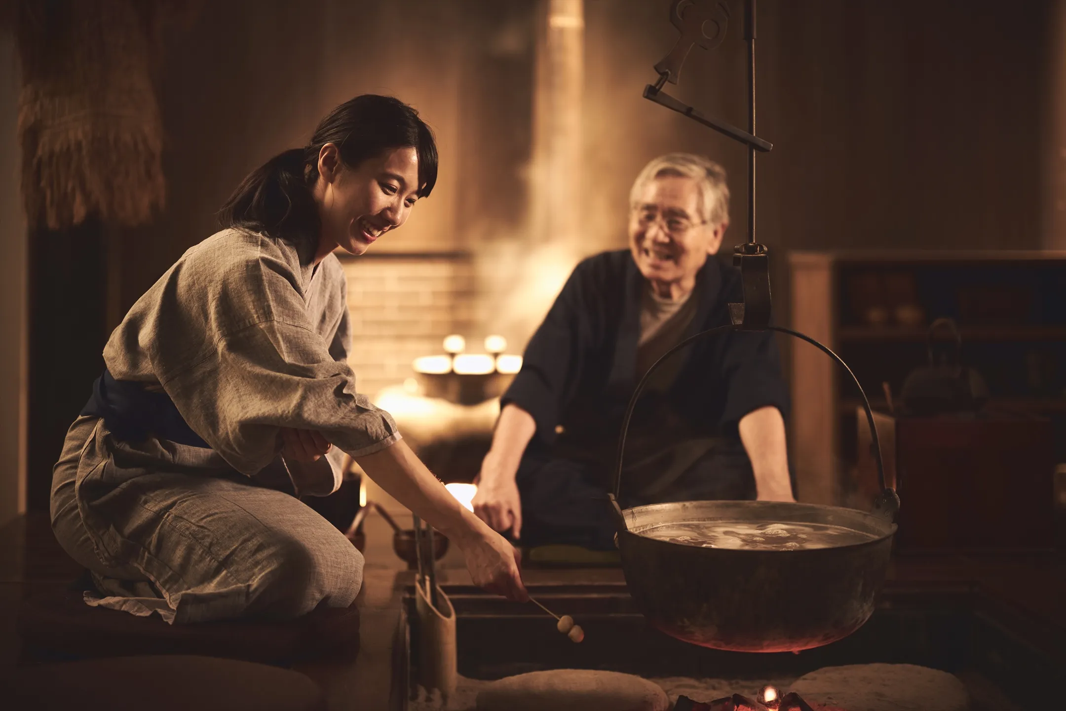 かつての日本家屋では、家族や親戚、友人が集う場として囲炉裏がありました。界 アルプスのパブリックスペース・土間にある囲炉裏にも、薪が燃えるぱちぱちという音や、火の温かさ、かまどからあがる湯気の香りなど、穏やかでゆったりとした時間が流れています。冬の期間は、昔ながらのあたためアイテム「お汁粉」と「カイロ」を用意しています。雪ん子の装いをしたゲストが集い、笑い声が響く光景は、雪国の日常そのものです。