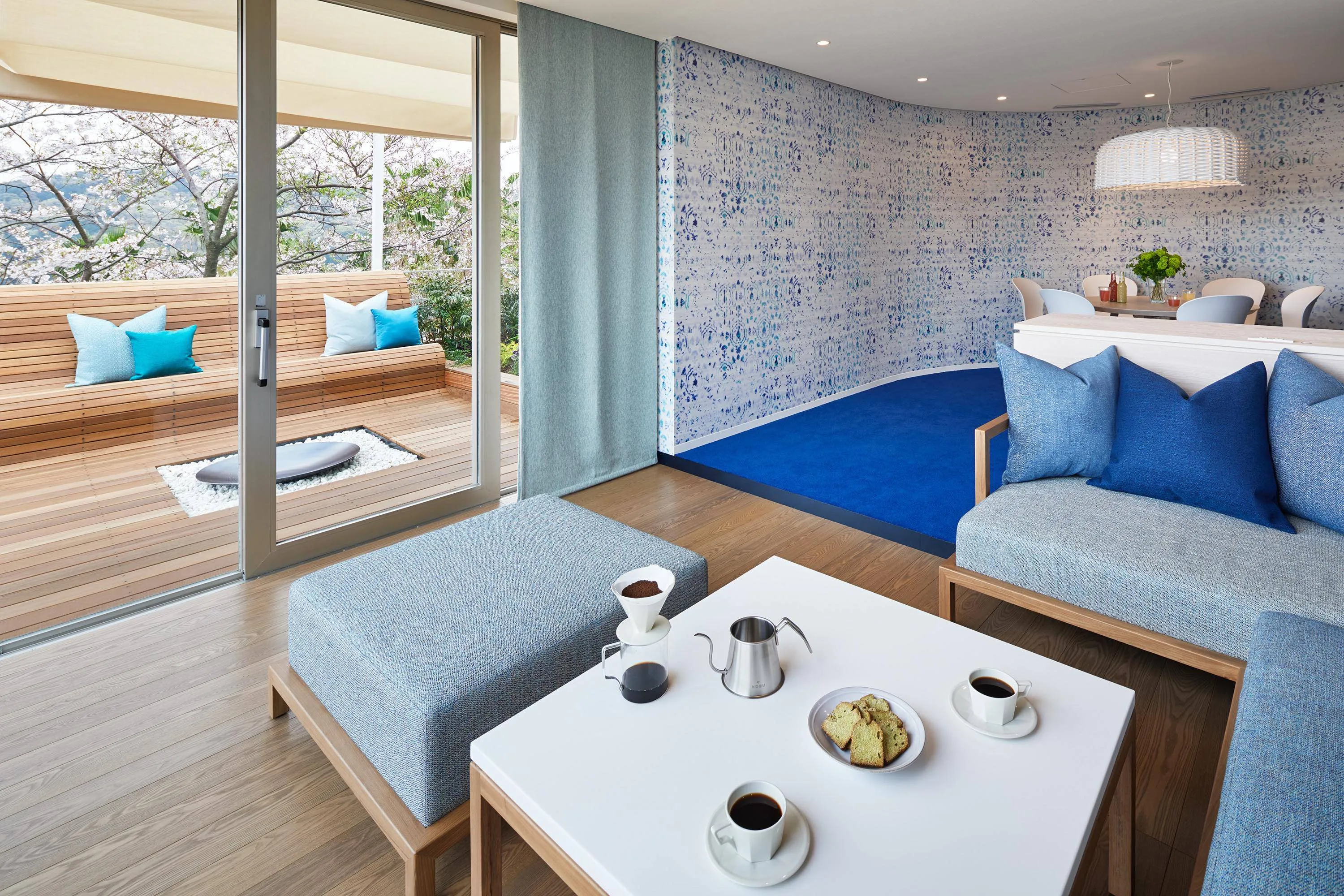本プランでは、相模湾を一望するテラスを備えた客室「テラスリビングコーナー」(定員6名/面積 109平米、テラス28.5平米)に宿泊できます。客室が桜の枝先と同じ位置にあるため、目線の高さで咲き誇る桜と、相模湾のコラボレーションを楽しむことができる絶好のロケーションです。テラスにラグとクッションを広げてお好みのくつろぎスペースを作り、三世代みずいらずでオーシャンビューの絶景花見を堪能することができます。
