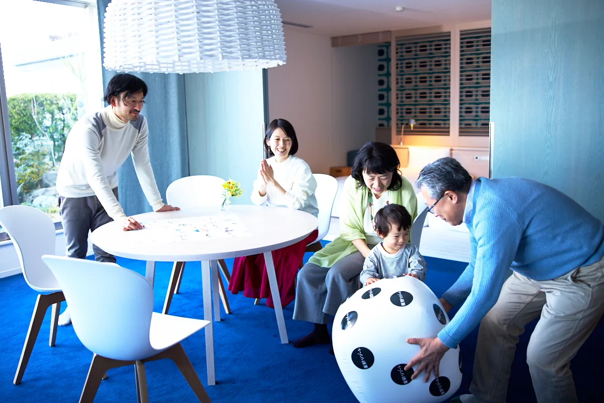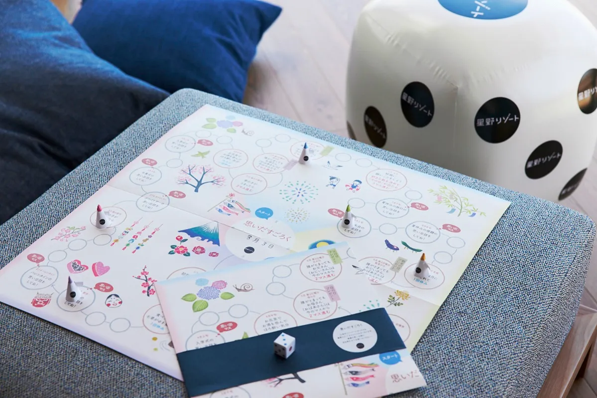 三世代の仲がより深まる仕掛けが詰まった星野リゾートオリジナルのすごろく「思いだすごろく」も用意。ホテルロゴが入ったオリジナルのサイコロ(サイズ 50cm×50cm×50cm)を転がして遊ぶことができます。止まったマスに書かれたイベントの思い出話に花を咲かせることで家族の会話が弾み、お互いの知らなかった一面を知るきっかけにもなります。お花見の時間がより一層思い出深くなる、三世代みずいらず旅ならではのアイテムです。
