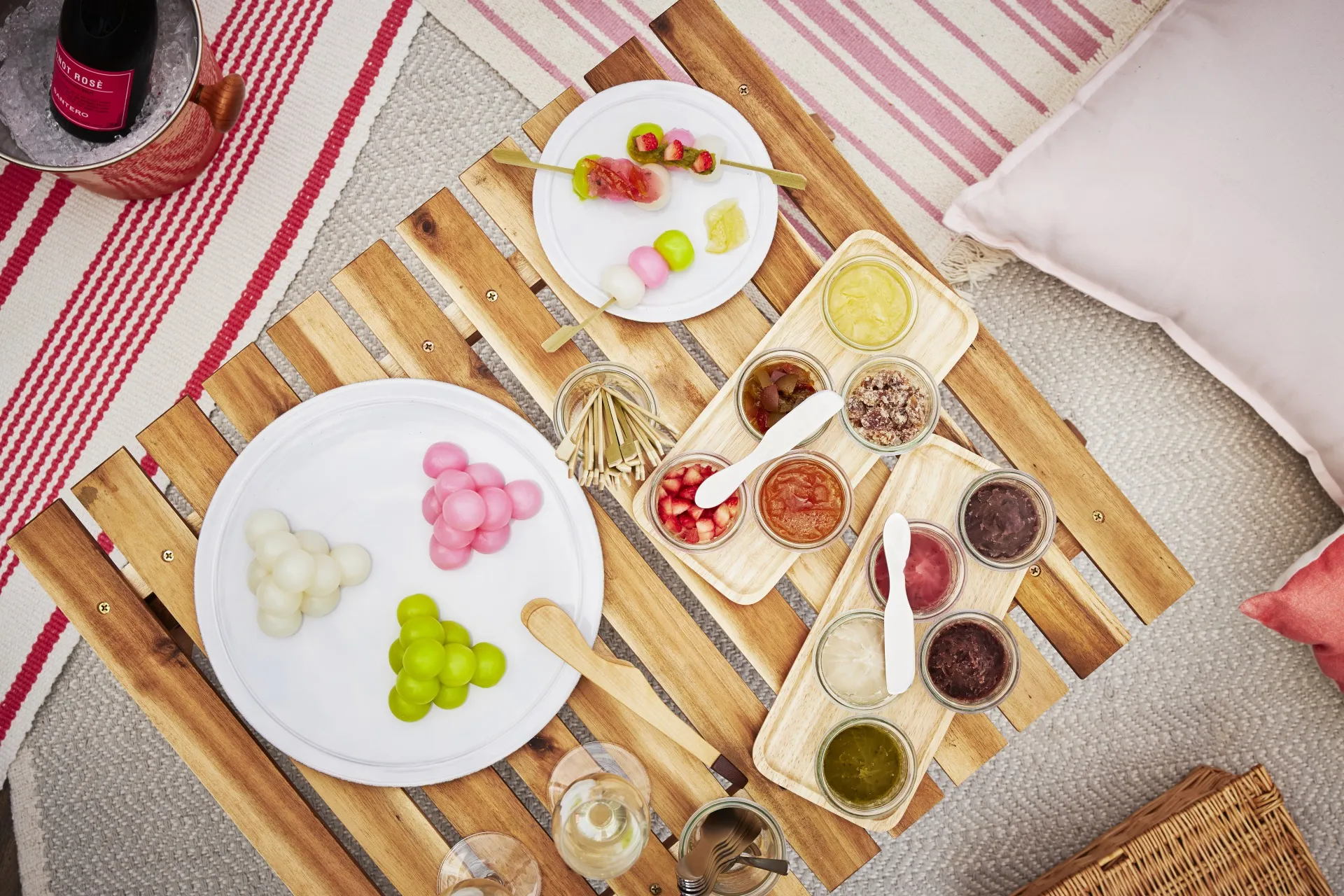 一口サイズのだんごを串にさし、5種類の餡とトッピングを組み合わせて楽しむことができる特典です。餡は熱海の老舗菓子店「間瀬」の協力のもと作成した、伊豆名産の「ぐり茶」を使用したオリジナルです。またトッピングは、ニューサマーオレンジジャムや橙マーマレードなどを取り揃えます。ドリンクは、静岡茶と炭酸をバランスよく混ぜたノンアルコールのスパークリングティー「Benefitea」とロゼスパークリングワインを提供します。