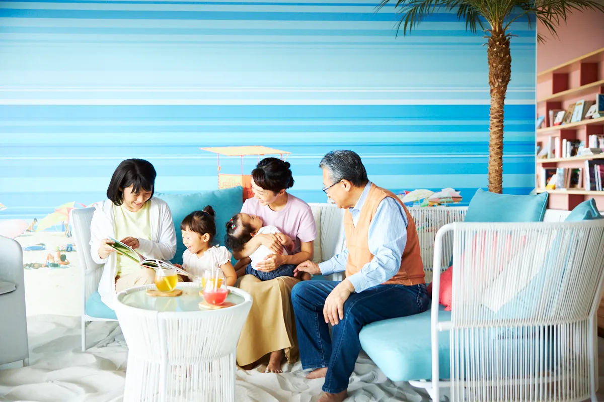 ソラノビーチBooks&Cafeは、熱海の高台に位置するという立地特性を活かした空間です。眼下に広がる相模湾を眺めながら、まるで空に浮かぶビーチにいるような気分を楽しむことができます。絵本を含む約600種類の本の中からお気に入りの一冊を選び、ドリンクと共に三世代揃ってリラックスした時間を過ごすことができます。