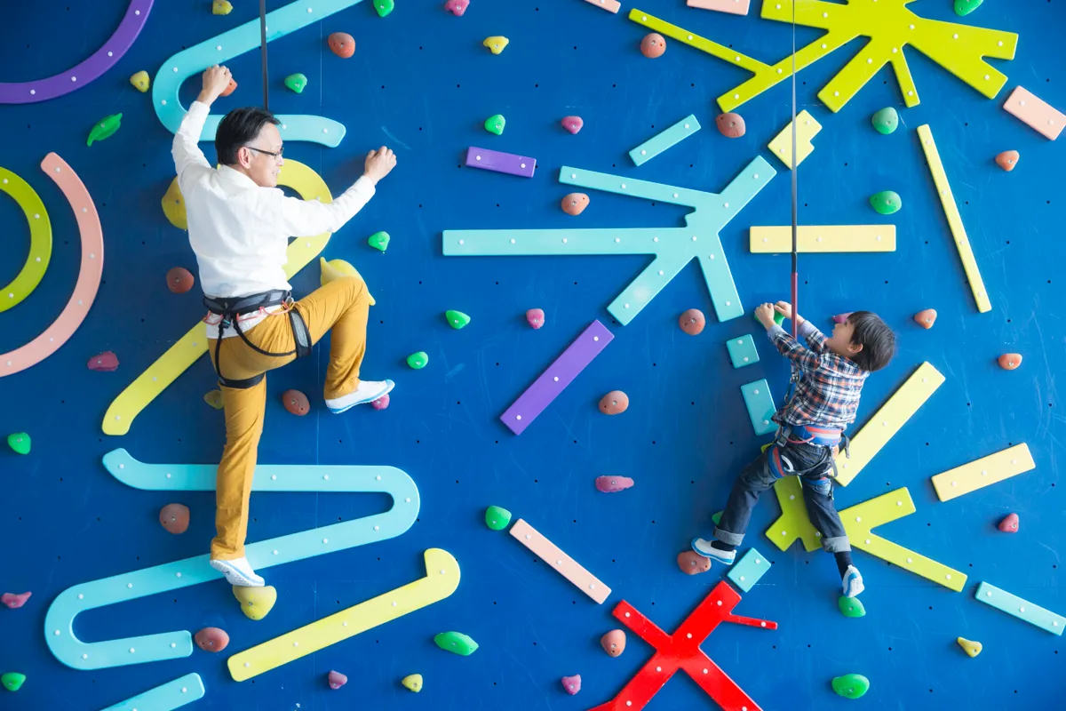 ●高さ6.5メートルのクライミングウォール「親子の北壁」で、一緒に体を動かす