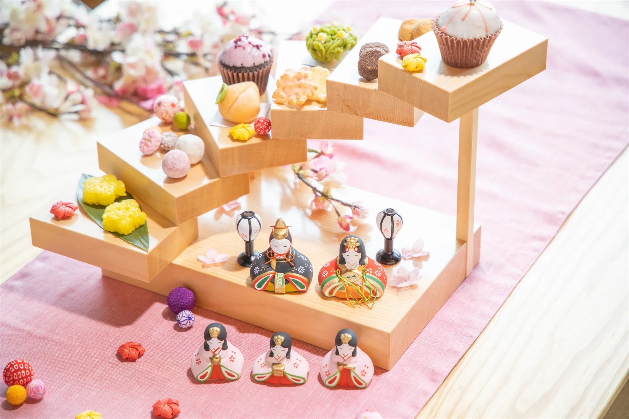 昔から伊豆稲取では桃の節句のお祝いに、黄色く炊いたご飯に黒豆をのせた「黄飯」を食べる文化があります。それにちなんで花型にかたどった黄飯や、ひな祭りらしい「桃」の練り切りを用意しました。ひな壇風に飾られたお菓子を囲んで、お子様の健やかな成長を願いながらお茶会を楽しめます。