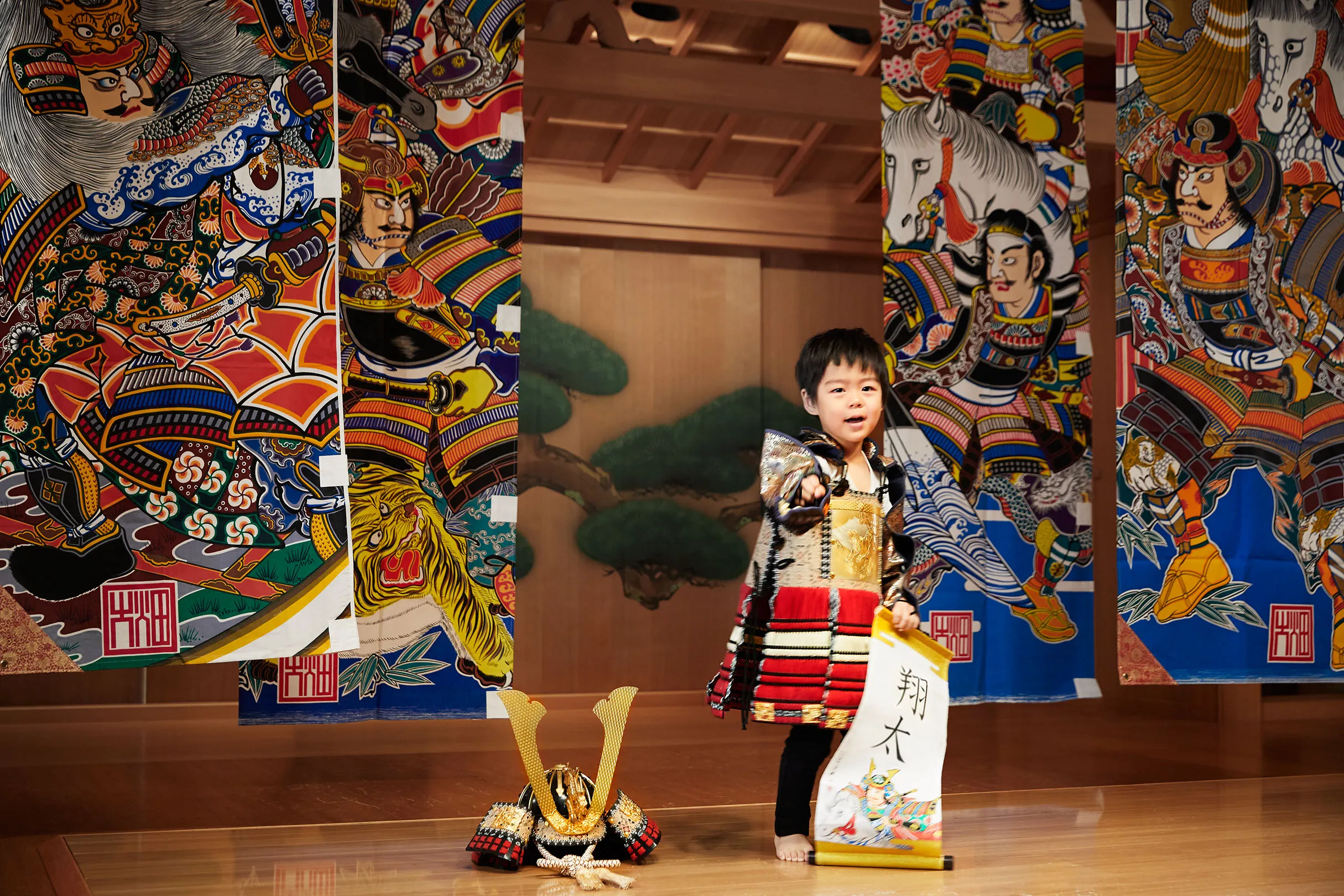 含まれるもの:名前入り武者のぼり、塗り絵体験、能舞台での記念撮影、