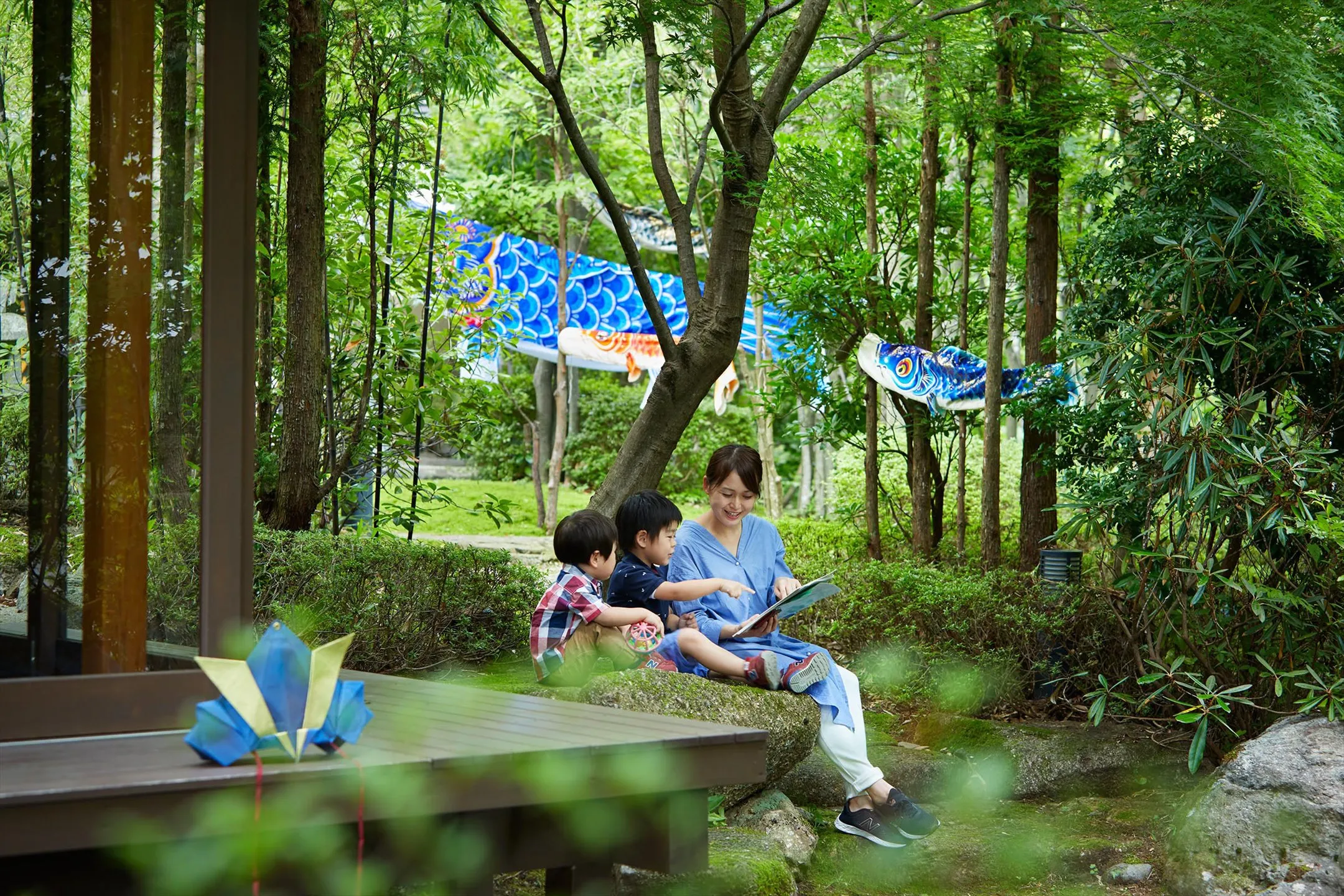 渓流沿いに佇む里山の温泉旅館「界 川治」では、「端午の森の落人節句滞在」を開催します。栃木県日光市には、源氏との戦いに破れた平家の武士が落ち延びたという「平家の落人伝説」が残る地域があります。落人の里には、追手から逃れるための独自の文化があり、その一つの「鯉のぼりを上げない」という風習が今でも残っています。界 川治ではこの伝説にちなみ、「端午の森」というテーマのもと、鯉のぼりを空に上げず、施設内の「胡桃の森」に泳がせて、子供の立身出世を願う催しを用意しました。鯉のぼりにくわえて、烏山和紙で作られた兜も飾ります。また、落人伝説を学ぶ紙芝居も開催します。この地に伝わる伝説を学びながら、風習に基づいた端午の節句のお祝いができるイベントです。