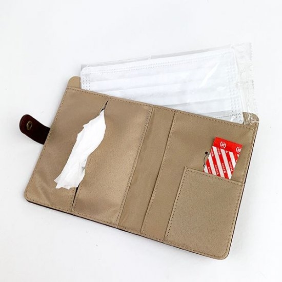 2つ折りのボタンを開くと、左側にはティッシュが入れられるポケットがあります。右側にはカードやメモ類などの他、バンドエイドなどの細かな物を収納できるミニポケットも♪