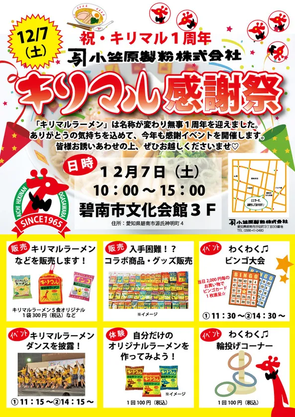 創業明治40年、小麦粉の製造・販売及び関連品の販売を手掛ける小笠原製粉株式会社(所在地:愛知県碧南市、代表取締役社長:小笠原 充勇)は、愛知県西三河地方のご当地即席めん「キリマルラーメン」の1周年記念イベントを12月7日(土)に碧南市文化会館にて開催します。
