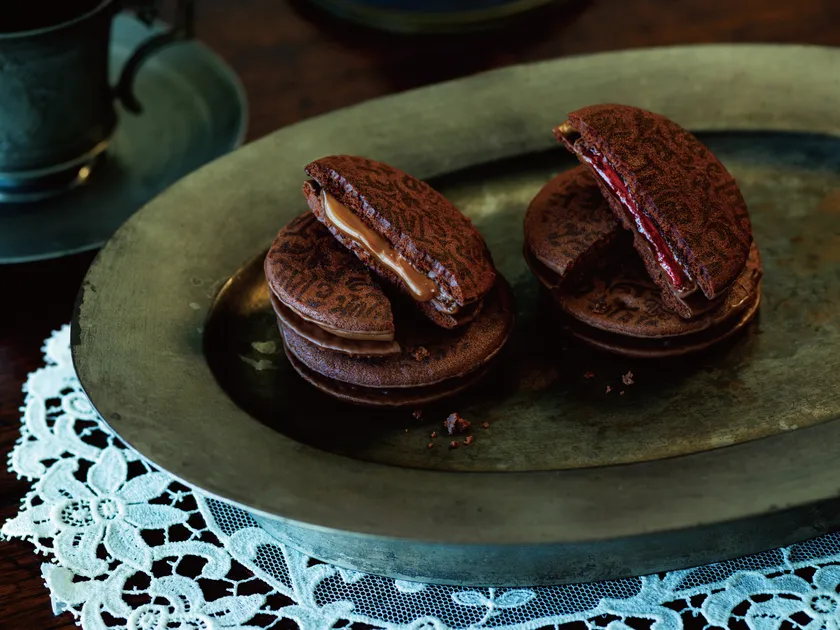 風味豊かな2種類のソースを、ミルクチョコレートでコーティングし、ココアクッキーでサンドした贅沢な味わいのショコラサンドです。