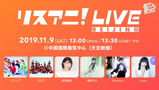 中国国際展覧中心(天笠新館)にて開催された“BICAF International Comic and Animation Festival 2019”のステージにて“リスアニ!LIVE BEIJING”が行われた。北京での初開催となった本イベントには、春奈るな、22/7、Liyuu、Machico、新田恵海、スフィアが登場し、北京の地に日本のアニメ音楽を響かせた。