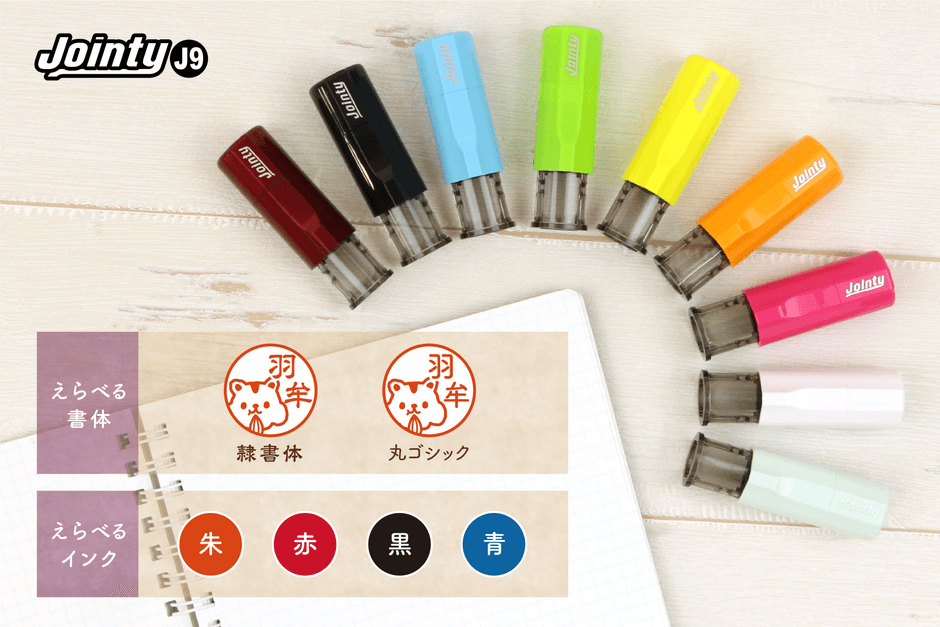 キャップレスで軽い押し心地の回転式ネーム印「Jointy J9」を採用。浸透印ではなくゴム印タイプのため、 イラストの細かい部分も鮮明に表現することができます。受取印や連絡帳、回覧板のサイン、職場でのマイマークなどにお使いいただけます。