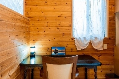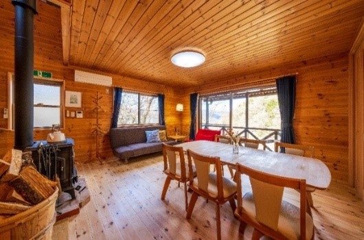 カントリー調の内装と窓から差し込む日光が融合する、四季を通して心地の良いリビング。まとまりのある空間で、家族や友人と全員で時間を共有できるスペースとなります。冬季は薪ストーブがご利用いただけるので、さらに雰囲気のある滞在が楽しめます。