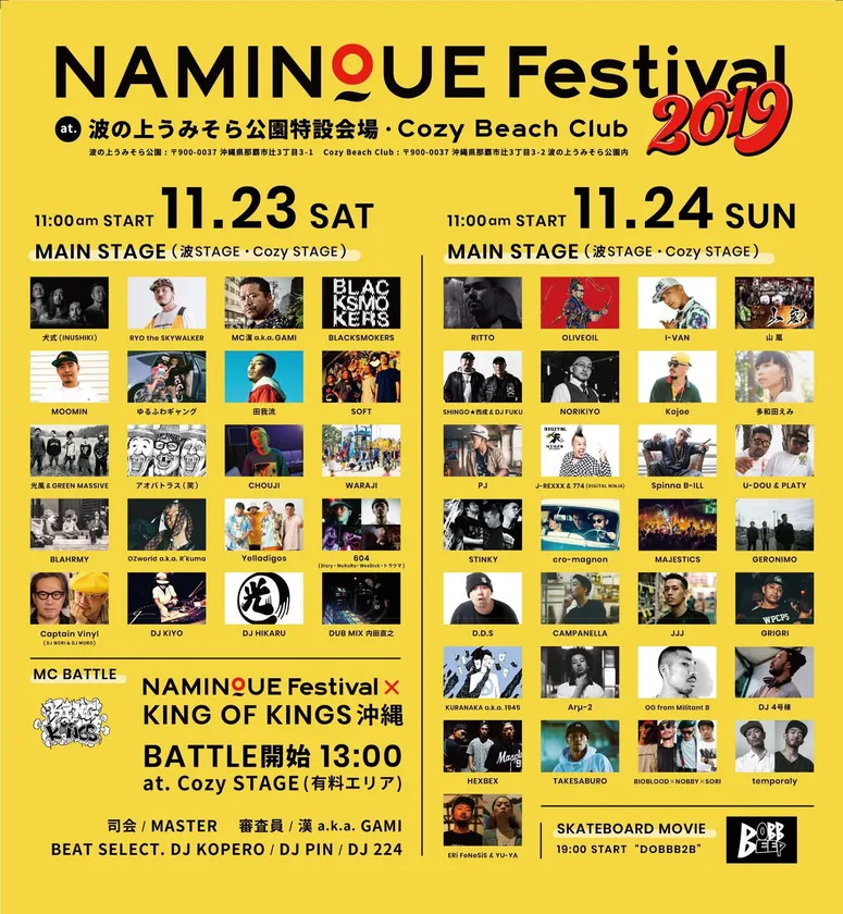 今回第二弾として開催するするNAMINOUE FESTIVAL 2019は、2019年11月23日(土)-11月24日(日)に開催し、昨年同様、那覇空港から車で約10分、那覇国際通りからも車で約10分の場所に位置し、沖縄でも有数の夕陽絶景スポットである波の上うみそら公園が会場となります。沖縄のストリートカルチャーを五感で体感できる波の上フェスティバルが今年も開催です!