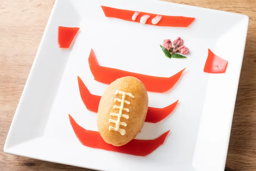 ●縞模様は白いお皿と赤いケチャップで、ボールの縫い目はマヨネーズ、胸元のロゴは桜の塩漬けで再現。