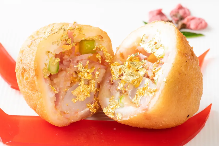 ●ゲン担ぎで金粉も餡の中に使用。※状況により金粉は餃子上部に乗せてご提供の場合もございます。