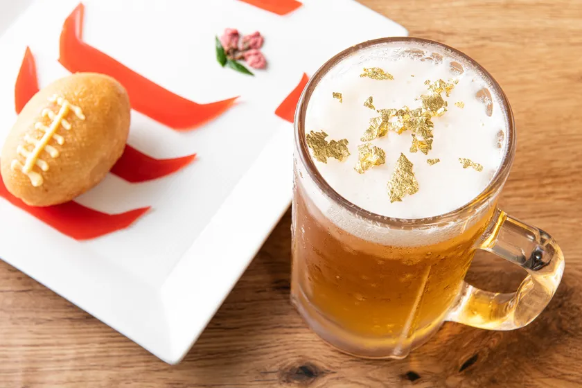 ●黄金色に輝く生ビールの泡に、金運アップの金粉を浮かべてご提供。