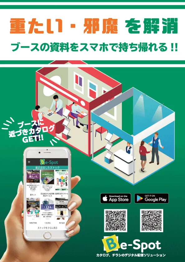 展示会やイベントの際に、参加者は、チラシやカタログの持ち運びを大変だと感じたことがあるかと思います。また、出展者側にとっても多量な資料の印刷コストや来場者がどのようなブースに興味があったか知りたいなどの悩みがあるかと思います。このような悩みを解決するのが、「Be-Spot」です。