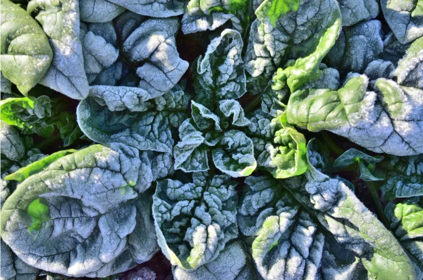 霜が降りたちぢみほうれん草。一般的ほうれん草と違い葉が広がる