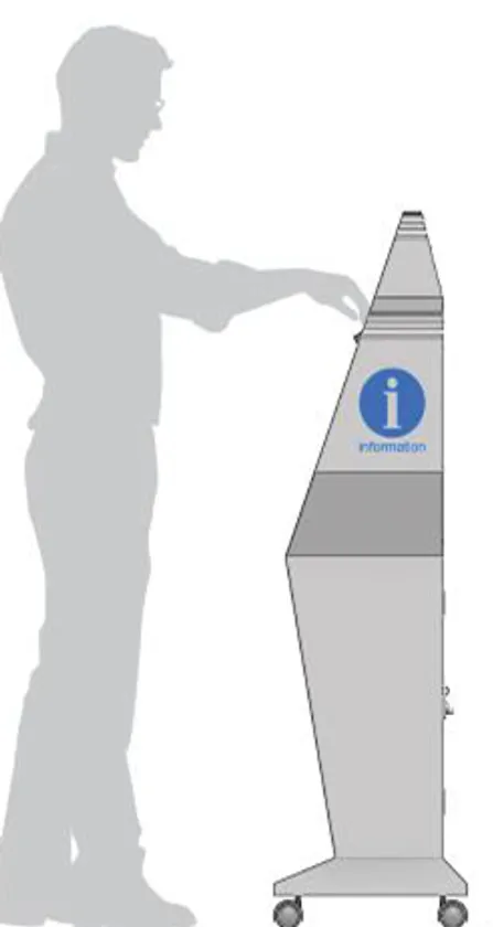 本実験での筐体デザインは、お客さまが周囲に気兼ねなくお問合せができるよう、One to One Communicationを重視して設計したため、小型ディスプレイを採用しています(筐体サイズ:高さ140cm×幅70cm)。