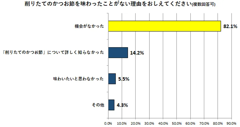 (2) 59.8%が「削りたてのかつお節」の味と香りを味わったことがなく、その理由は「機会がなかった」からという回答が82.1%。