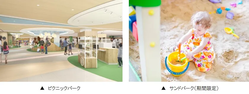“ピクニックパーク”と名付けた遊び場は、お子様連れでゆっくりと過ごせる芝生のプレイスペース。また、期間限定で登場する“サンドパーク”は、有機物がほとんど含まれず雑菌などが増殖しにくい「ホワイトサンド」を使用しており、お子様を安心・安全に遊ばせられます。