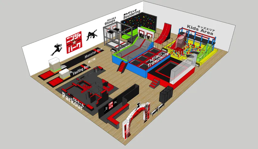 トランポリン・ボルダリング・パルクール・跳び箱(モンスターボックス)・9hoops(バスケットボールゲーム)・キッズエリアなど、お子様から年配の方まで全世代に向けて、3世代パークとして“遊びながら体力がつく”“地域に密着した”アミューズメント&スポーツパーク施設として、全国各地に展開していきます。