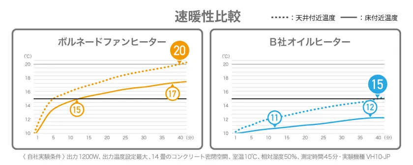 ・実験結果は14畳の部屋での数値です。8畳の部屋ではより短時間で温まります。