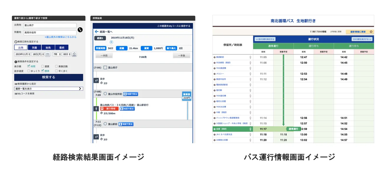 これにより「とやまロケーションシステム」の利用者はパソコン・スマートフォン・フィーチャーフォンで目的地までの経路検索とバスの現在地などの最新情報をいつでも確認でき、バス停での待ち時間の削減や定時性の確保が困難なバスを安心して待つことが可能になります。