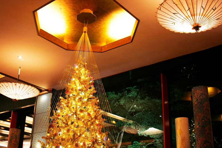 12月25日まで、煌びやかな金色のクリスマスツリーがお出迎え。加賀九つの伝統を、ツリー&空間を使って演出しています。