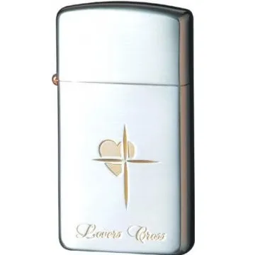 通常タイプと比較して、幅が狭く、軽くて持ちやすいスリムサイズの Zippoライター。シルバーカラーの表面にピンクゴールドのハートとクロスが映え、性別を問わずに使用できるデザインが特徴です。