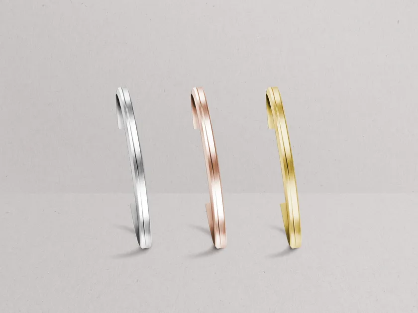 バングルの表面には、本ブランドの腕時計のケースと同じ一本の美しいラインを象っておりシンプルでミニマムでありながら、どこか特別さを感じるデザインに仕上がっています。