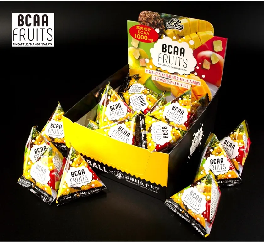 太陽の光をいっぱい浴びたトロピカルフルーツにBCAAをコーティングした今までにない新しい「BCAA」の補給です。1袋18g入でBCAA1000mg、エネルギー66.4kcalが補給できます