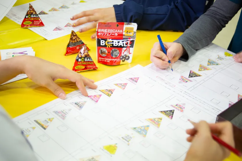 当初はチョコレートの味の改善を検討していたため現行品合わせて5種類の試作品にて検討。すると私たちの予想を覆す意外な結果に。数種類用意したチョコレートの試作品を抑え、遊び心で試作した「フルーツBCAAコーティング」がなんと1番人気。