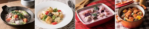 左から)甘酒と麹の発酵鍋、白身魚のマリニエール、鶏もも肉とビーツのクリーム煮、豚肉のトマト煮込みほうれん草のニョッキ添え