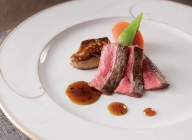 絶妙な焼き加減で仕上げたフォアグラとステーキに、トリュフソースを絡めて味わうメイン料理。