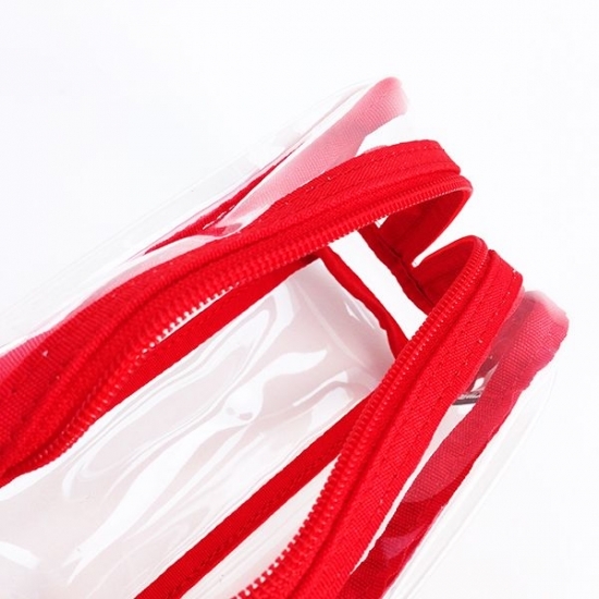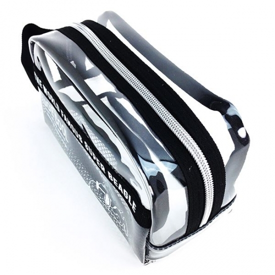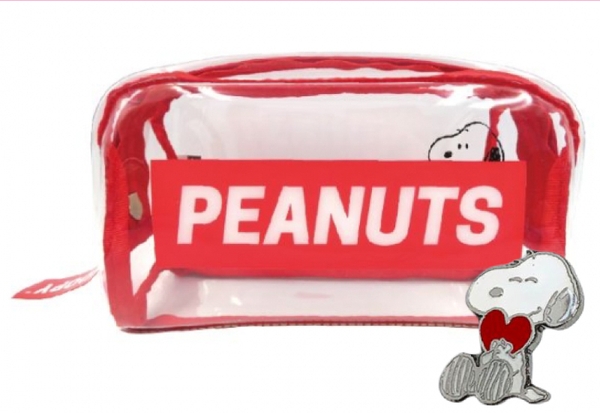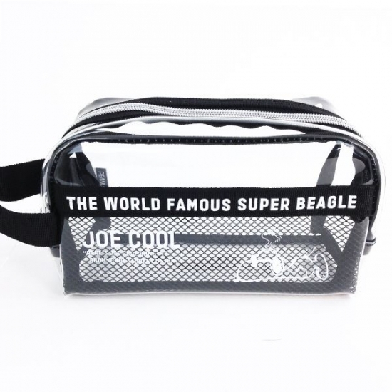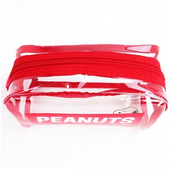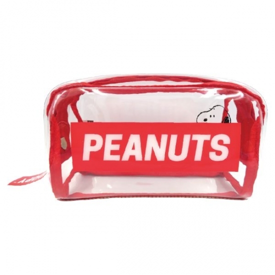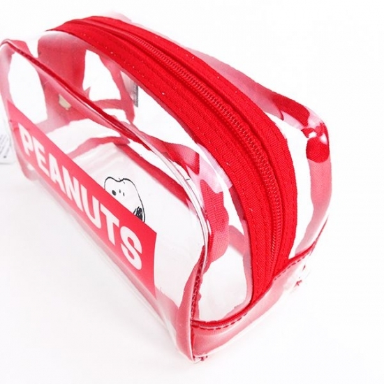 大きくロゴがデザインされていて、チラっと見えるスヌーピー♪透明なPVC素材に、赤の縁取りが利いています。たっぷり入るサイズなので、ペンポーチとしてだけでなく、用途もいろいろです。これだけクリアだと、中身も探しやすくて便利ですよね。