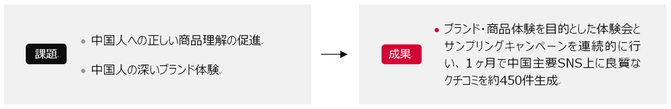 その結果、30名を招待した体験会から1ヶ月間で、中国主要SNS(Weibo、WeChat、小紅書)において約450件もの良質なクチコミを発生させるという成果を生み出しました。1人から複数のSNSへのクチコミが発生しているケースもあり、ブランド・商品に対するBoJapanメンバーの熱量の高さがうかがえました。日本と中国での発売タイミングを予め見越した上で、参加者の熱量が高い水準で保持されるようなタイミングを見極めて各施策を連続的に設計し実施したことで、深いブランド体験の提供に加え中国向けマーケティングにおける成果を生み出すことに繋がりました。