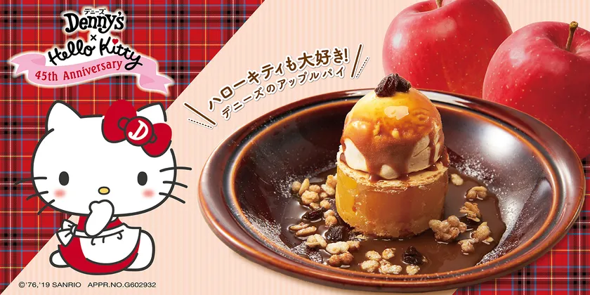 今年45周年を迎えたデニーズ(株式会社セブン&アイ・フードシステムズ 東京都千代田区二番町8-8)では、2019年11月26日(火)より、同じく45周年を迎えた株式会社サンリオのハローキティとコラボし、焼き立てのアップルパイなど、全5品を取り揃えた林檎デザートを販売いたします。