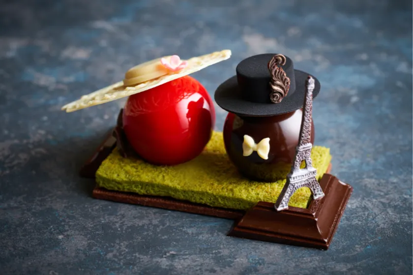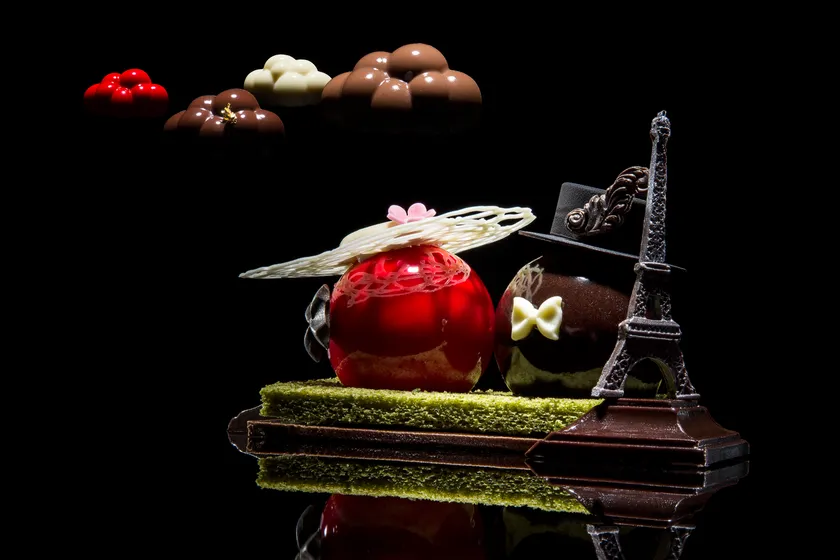 毎年ご好評をいただいているシェフ ステファンによる帽子型ケーキ「プロムナード」シリーズ。今年はエッフェル塔を傍らにパリの街を散歩する愛らしいカップルを表現しました。ラズベリーとピスタチオのムース、たくさんの果実が香るフレーバーティーとイチゴのムースの2種類をお愉しみいただけます。