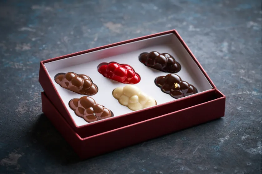 シェフ ステファンのシグネチャー「KUMO(R)」ケーキから生まれたボンボンチョコレートが初登場。「柑橘」、「木の実」、「フルーツ」、「柔らかさ」、「苦み」、「リッチ」の6種の秘密の味をご用意いたしました。