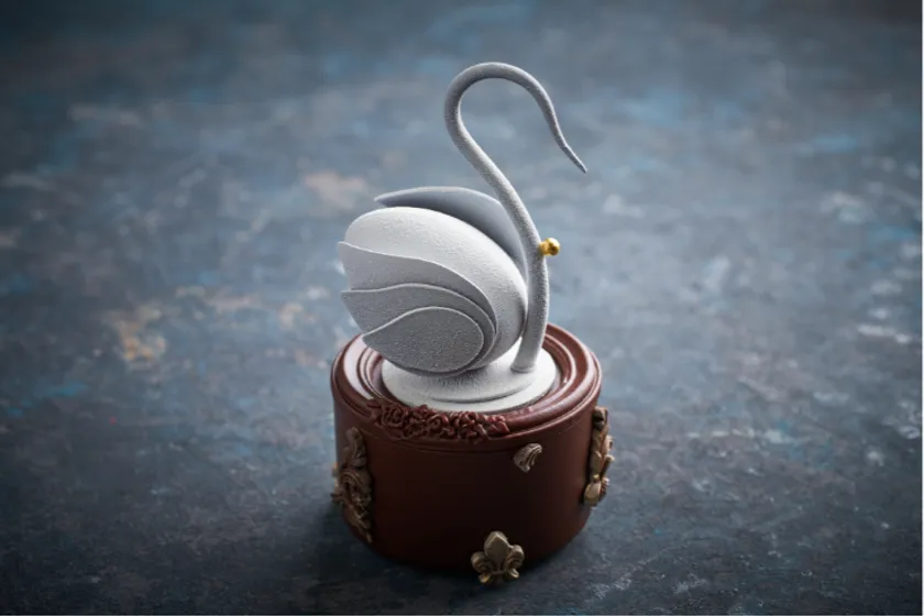 白鳥をあしらったオルゴール型のチョコレートには、薫り高いトリュフ、ほのかな苦みと甘みのオランジェット、香ばしいアーモンドを使用。中には、シェフ ステファンからのサプライズチョコレートが隠れています。