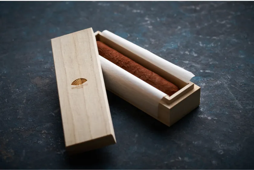 本物のシガーのような、チョコレートクランチのサクッとした食感がアクセントのユニークな形のチョコレート。燻製させた砂糖を使用したブラックチョコレートは、芳醇で大人な香りが特徴。ホテルロゴの刻印入り木箱にてご用意するシガーは、大人のプレゼントに最適です。