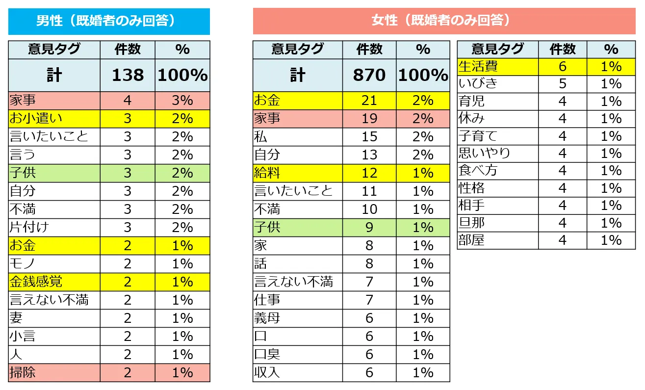 「現在の結婚生活での、言いたくても言えない配偶者への不満」について回答者の声を分析したところ、「家事」「お金」「子育て」に関する不満が多くあがりました。お金関連では、男性は妻からもらう「お小遣い」や妻の「金銭感覚」、女性は夫の「給料」や「生活費」に不満があるようです。
