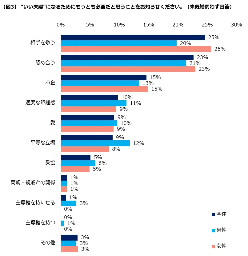 男女別に見ると、男性は「平等な立場」(12%)、女性は「相手を敬う」(26%)が他よりも目立ちました。