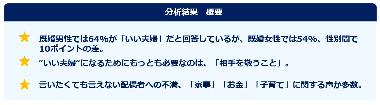 株式会社Insight Tech(本社:東京都新宿区、代表取締役社長:伊藤友博)が運営する「不満買取センター」上で、不満買取センター会員を対象に「いい夫婦」に該当するインサイトデータ1,449件を収集。解析ツール「ITAS」で解析を行ないました。以下、結果をご報告いたします。