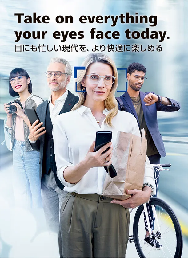 常にマルチタスクが要求される現代のライフスタイルでは、アナログ刺激とデジタル刺激の間で焦点を絶えず変える必要があります。スマートフォンを片手に動き、そして会話の途中でもスマートフォンをチェックしなければならないこともあります。私たちの視線は2種類の刺激の間を頻繁に移動するだけでなく、距離や方向の異なる対象間も忙しく移動しています。これは単なる認知機能の向上が要求されるだけではありません。私たちの目は「重労働」をしなければならないのです。快適な視界のためには、個々の視覚ニーズに応じたメガネレンズを装用するという形で、個別化された視覚的なサポートを受けることが重要です。