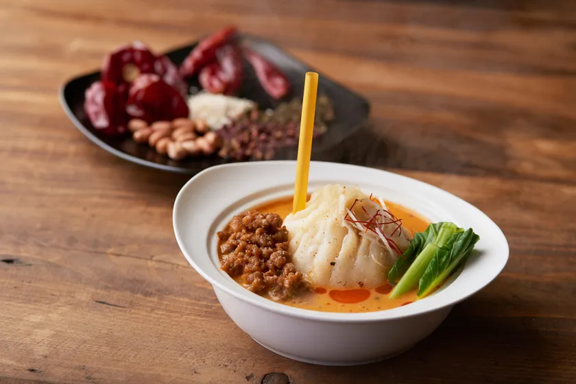 香り高い花椒(ホワジャオ)をきかせた担担スープを大籠包にかけた一品。後を引くピリッとしたしびれる辛さと濃厚なゴマの風味が合わさり食欲をそそります。肉汁だけをまずはお楽しみいただき、割って大籠包と絡めれば、辛さが和らぎマイルドな味わいに。ぽかぽか体も温まり、男女問わずおすすめです。